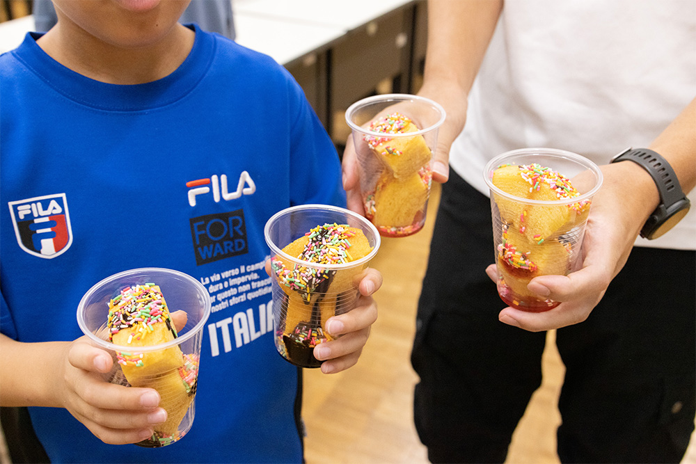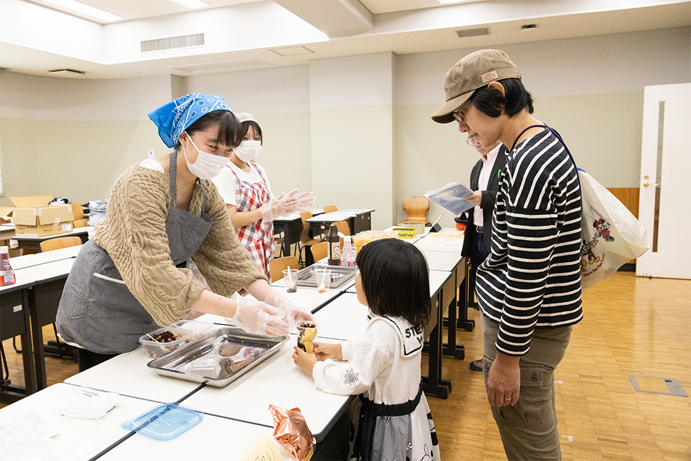 子どもたちに人気だったのはスポーツ大会の救護活動などに取り組んでいるサークル「川崎メディックス」が販売するバウムクーヘン。チョコレートソースとストロベリーソース、さらにドライフルーツやチョコスプレーのトッピングも選べました。