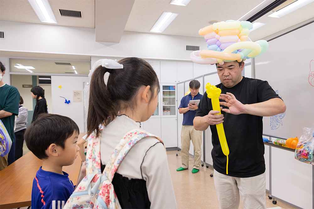 「南加瀬こども文化センター」は自分の好みの色を組み合わせて作るぶんぶんごま作りと、バルーンアートを開催。バルーンアートアーティストに花や、クマ、ライオン、プードル、剣など好きなモノをリクエストして作ってもらった子どもたちの歓声と笑顔が会場内にあふれていました。