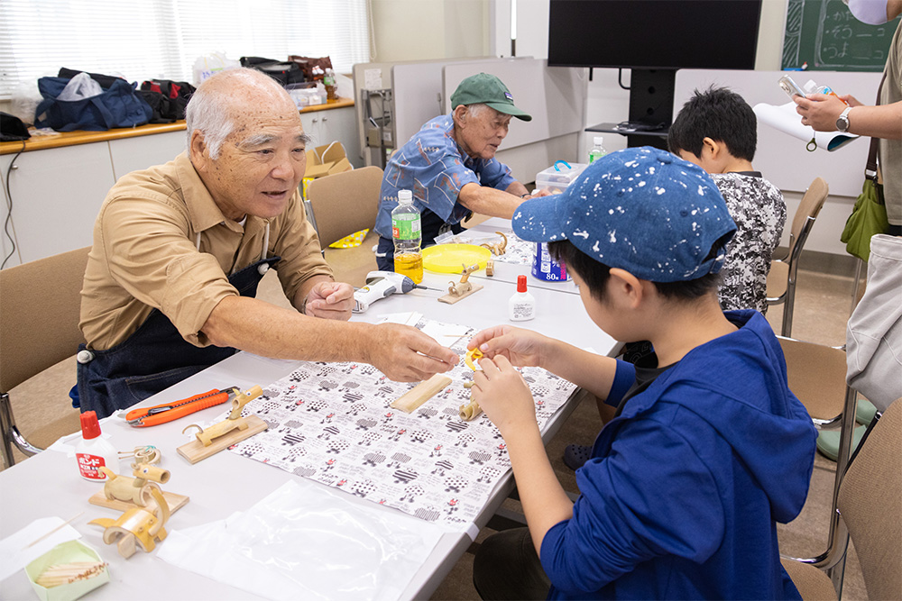 竹細工サークル「かたつむり」は地域貢献委員会の学生と共同で竹細工を体験できるコーナーを開催。あらかじめ初めての人でも工作できるキットを用意していただき、メンバーの方々の指導でぞうやかたつむり、鳥などを作りました。「かたつむり」のメンバーの方々は川崎市社会福祉協議会のイベントなどにも参加されています。