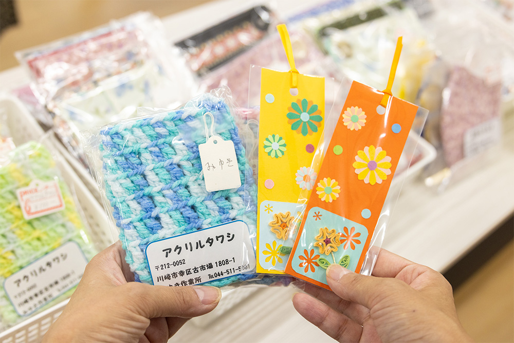 地域活動支援センター「みゆき作業所」は、通所している方々が作った花たわし、ちりめん根付け、手作りマスクとマスクカバーなどカラフルな小物を販売。多くの来場者がその見事な出来映えの商品を手に取って眺め、購入していました。