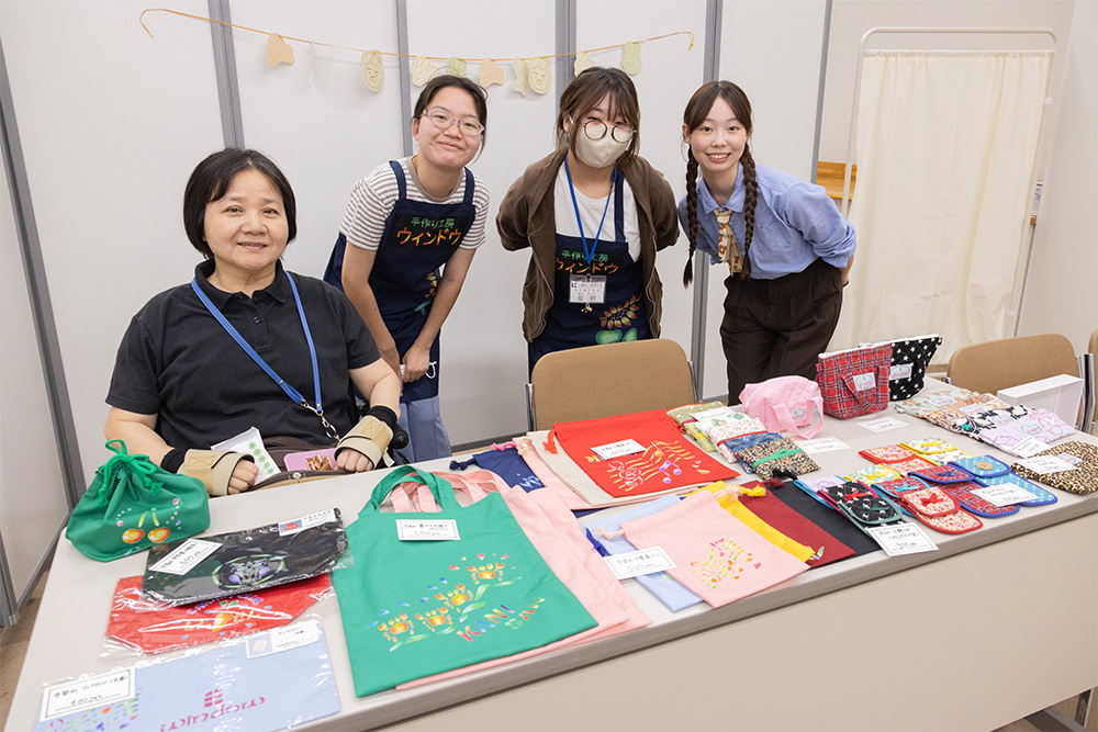 「NPO法人ウインドウ」は障がいのあるメンバーによる手作り小物販売店「手作り工房ウインドウ」を出店。手提げ、弁当袋、巾着袋、小銭入れ、ブックカバー、キルトケースなど、どれもオシャレで味のある商品ばかりでした。