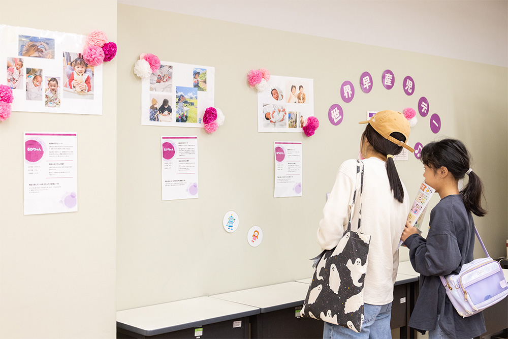 小さく産まれてきた子ども、発達が遅い子どもなどの居場所を作る活動を展開する「Toiro川崎~Little Babyママの会~」は本学の教員も運営に携わっており、青朋祭には一昨年に続く2度目の参加。11月17日「世界早産児デー」に向けて、「小さく産まれた子ども達の写真展&釣り堀」を開催し、来場した親子が楽しめるおもちゃやお菓子の「釣り堀」も好評を博していました。