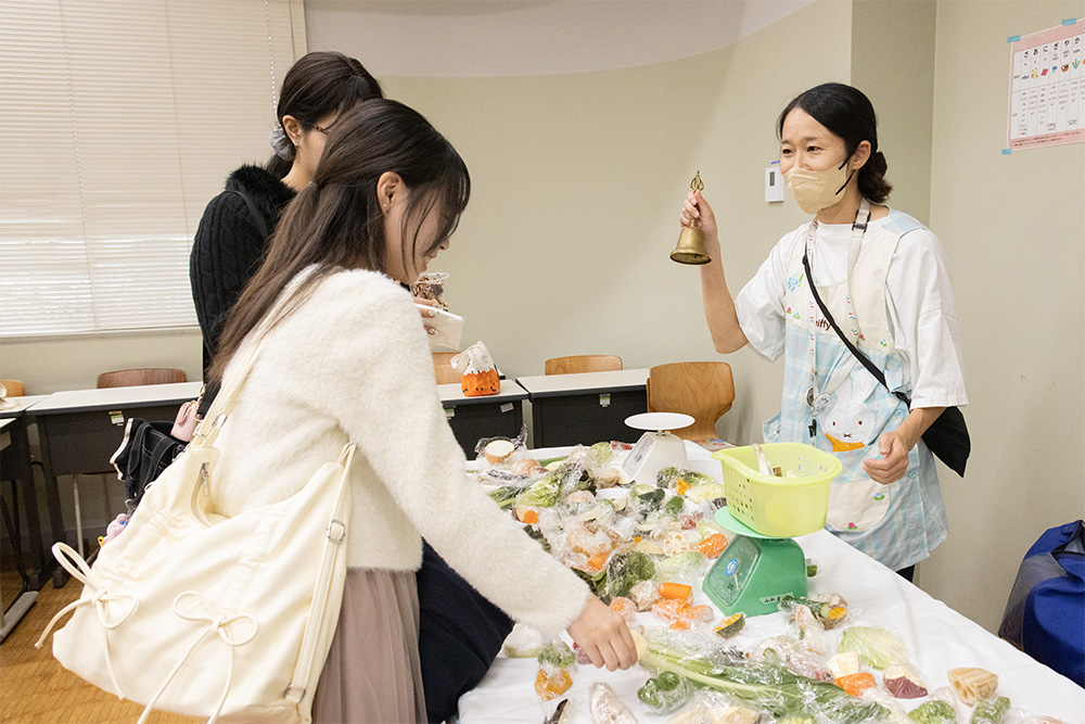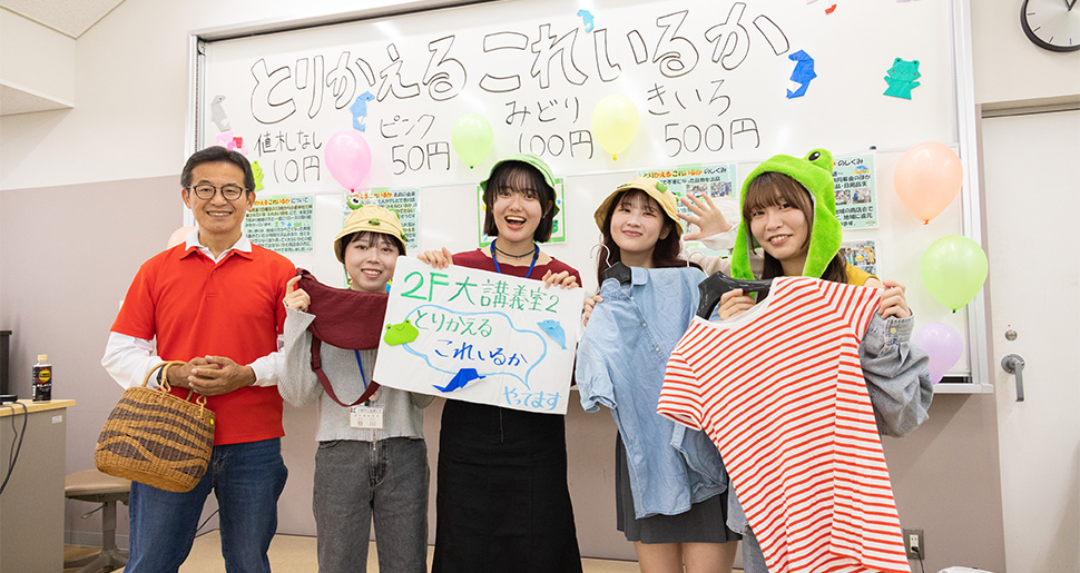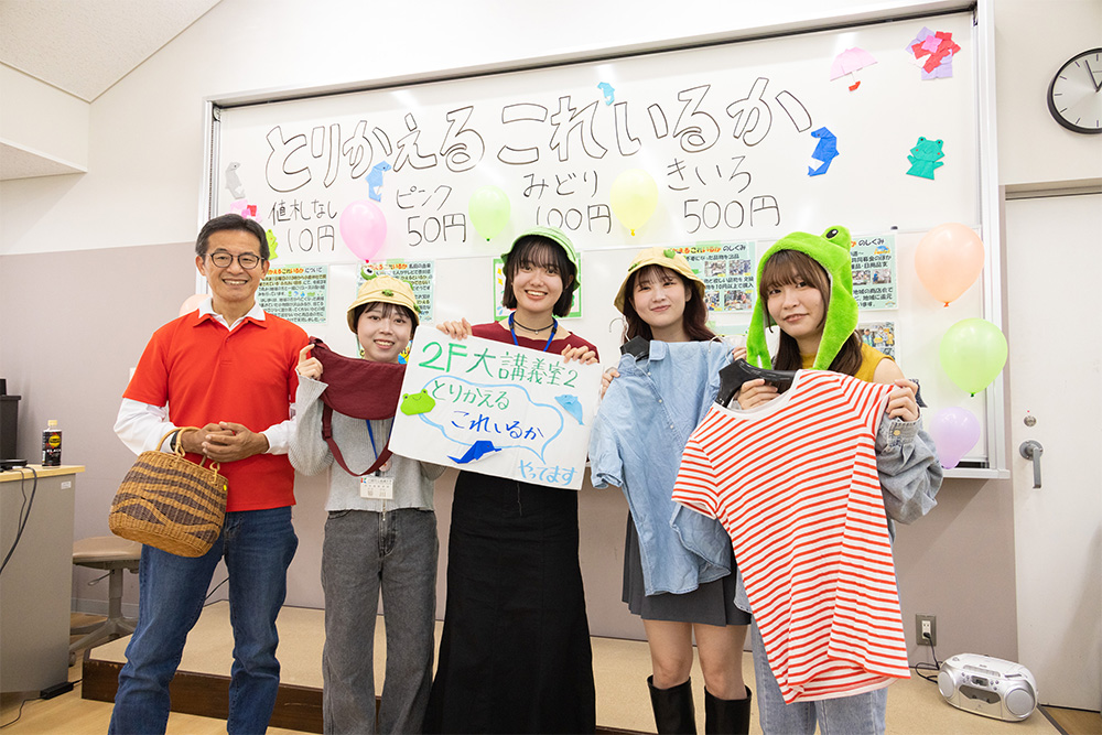 「とりかえるこれいるか」は「捨てればゴミに、使えば資源に」をテーマに、学校近隣にある小倉神社のふれあい朝市にて取り組まれている、リユースを目的としたフリーマーケット。本学の学生や教員がまだ十分使える多種多様な商品を提供し、当日は、「かえる」のかぶりものをした地域貢献委員会の学生たちが来場者をご案内しました。