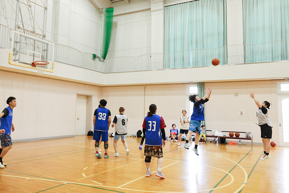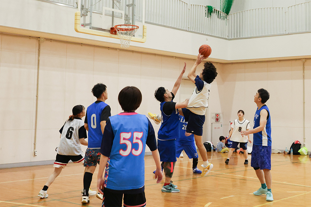 まず当日の朝一番から、「バスケットボール部」が川崎市役所のチームと体育館で男女混交の招待試合を行いました。両チームとも全力を出した一進一退の激戦となり、結果は引き分け。ちなみに本学チームは翌日、山梨県まで遠征して公式戦を戦い、見事2連勝、その後も勝ち進んでベスト8進出を果たしました。
