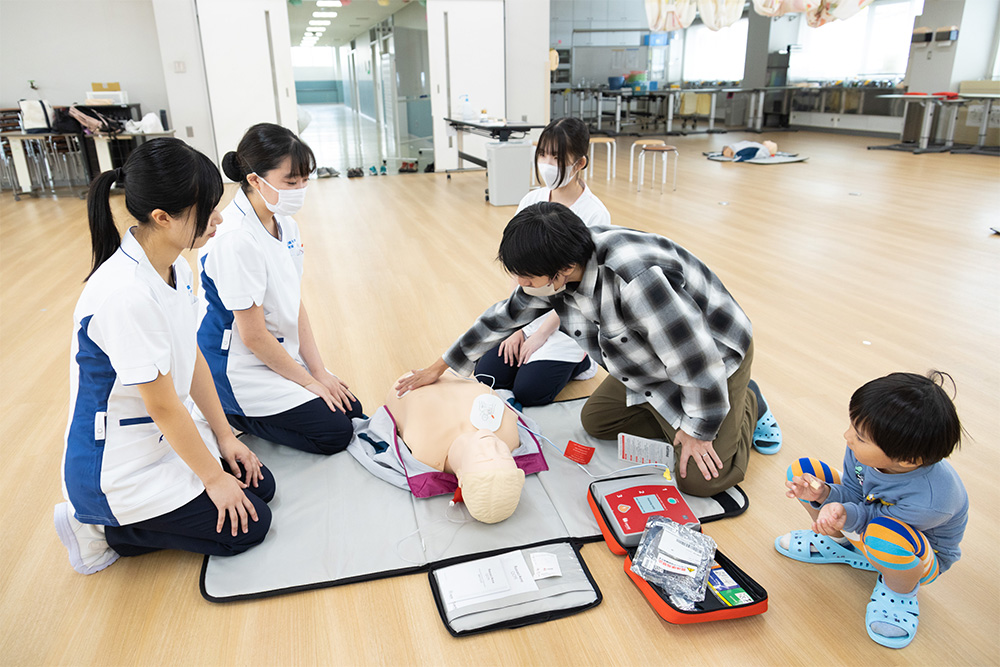 バウムクーヘンの模擬店を出店していた「川崎メディックス」は、本来の活動を生かしたAED(自動体外式除細動器)体験を開催し、AEDを使う場面や使い方をレクチャーする企画を開催。学生が胸骨圧迫やAEDの操作手順を実演し、初めて機械に触れる来場者たちが熱心に取り組んでいました