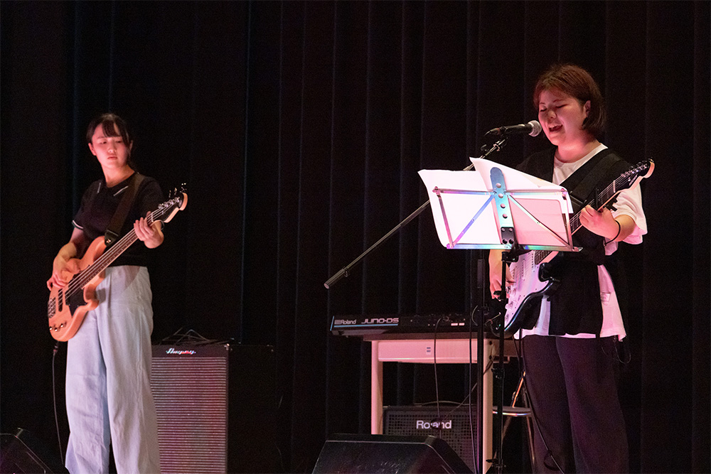 ステージの最後を飾ったのは毎年出演する「軽音サークル」でした。曲によってメンバーが代わるバンドには学生に加えて教員もヴォーカル、キーボード、ベース、ドラムでゲスト出演。学生世代から親の世代までが楽しめる幅広いジャンルの曲を演奏しました。会場はアットホームなムードに包まれ、手拍子をしたり、一緒に歌う観客もたくさんいました。